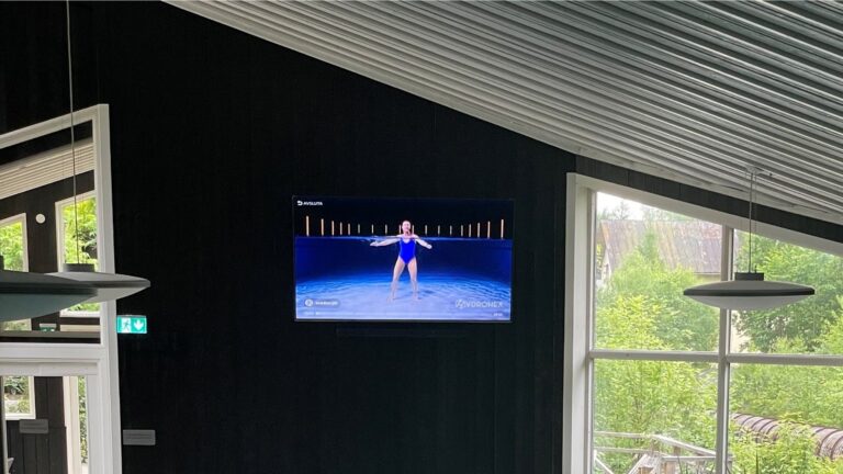 Det är helt upp till er hur stor skärm ni vill använda! Vi rekommenderar att använda 65" eller större skärmar. Detta för att de på ett säkert sätt ska kunna installeras på en trygg distans från bassängen, men ändå så att det är lätt att se. Du kan även betjäna en större grupp genom att ha en större skärm.